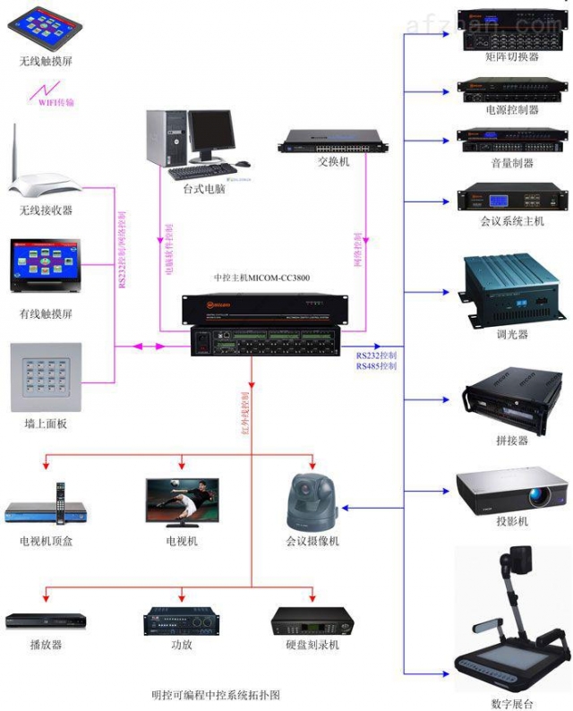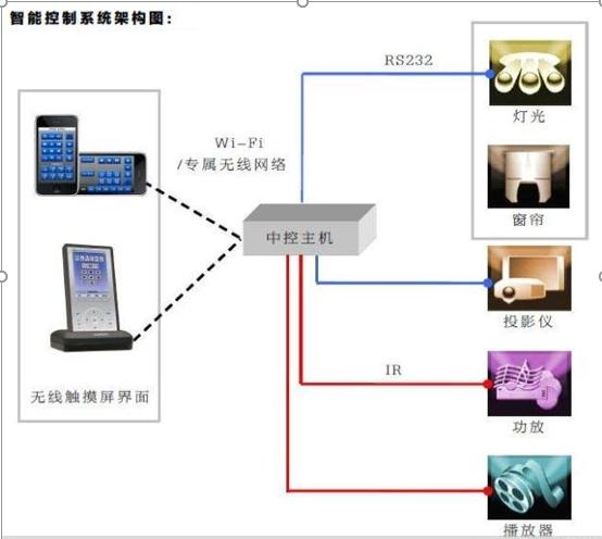 中控系統(tǒng)主機包含多種控制接口:RS232、RS485、紅外和IO。中控主機可以接駁多種周邊控制設備,如電源管理器、調光器、DXM512燈光重演器、數(shù)字音頻處理器等等,有了這些周邊控制設備,中控系統(tǒng)就可以輕松地控制燈光及設備電源的開關、電腦搖頭燈的各種變光擺動、多通道音頻信號的切換及調節(jié)音量大小。