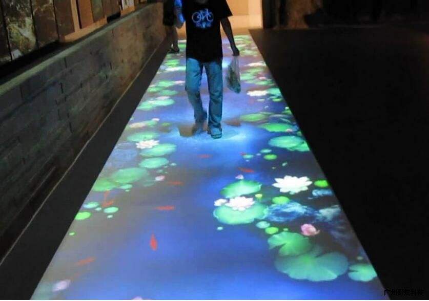 地面互動投影技術是最受歡迎的一項技術,是指利用計算機制作出虛擬畫面,通過投影投射到地面的指定區域內,再加上該系統中有感應系統,當人們走到指定區域時,人們的腳步動畫就會和虛擬場景進行交互,隨著人們的腳步而變化。地面互動投影也可以設計地面互動游戲,讓人們用腳來玩游戲,給人們一種全新的體驗。