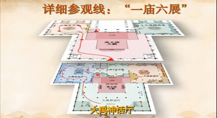 大禹文化園,總建筑面積13190平方米,建筑風格為仿漢代建筑,總體布局分為“一核”“一軸”、“兩翼”。建筑風格為仿漢代建筑,總體布局分為“一核”“一軸”、“兩翼”。“一核”為水路交通轉換核;“一軸”為建筑景觀中軸線,這一軸線上建有碼頭、廣場、牌樓、入口大門、鐘樓、鼓樓、明堂、大殿;“兩翼”作為主軸上建筑與文化延伸及視覺延伸,建有河圖洛書、九州苑、大禹雕像。整體建筑高度由西向東逐級增高,高差31.05米,形成錯落有序的布局。