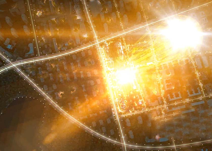 擔綱一座城市的自信360度全景,鏡頭跟隨著logo來到項目地上空,一瞬間崩裂成閃耀的水晶, 漂浮在項目上空展現東南部的氣勢,到仰望哈東華府中心