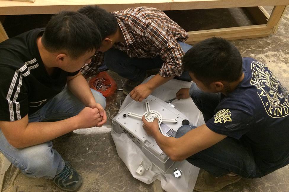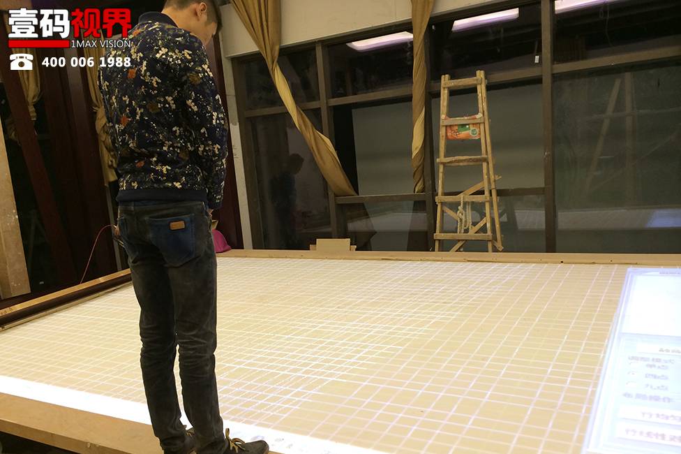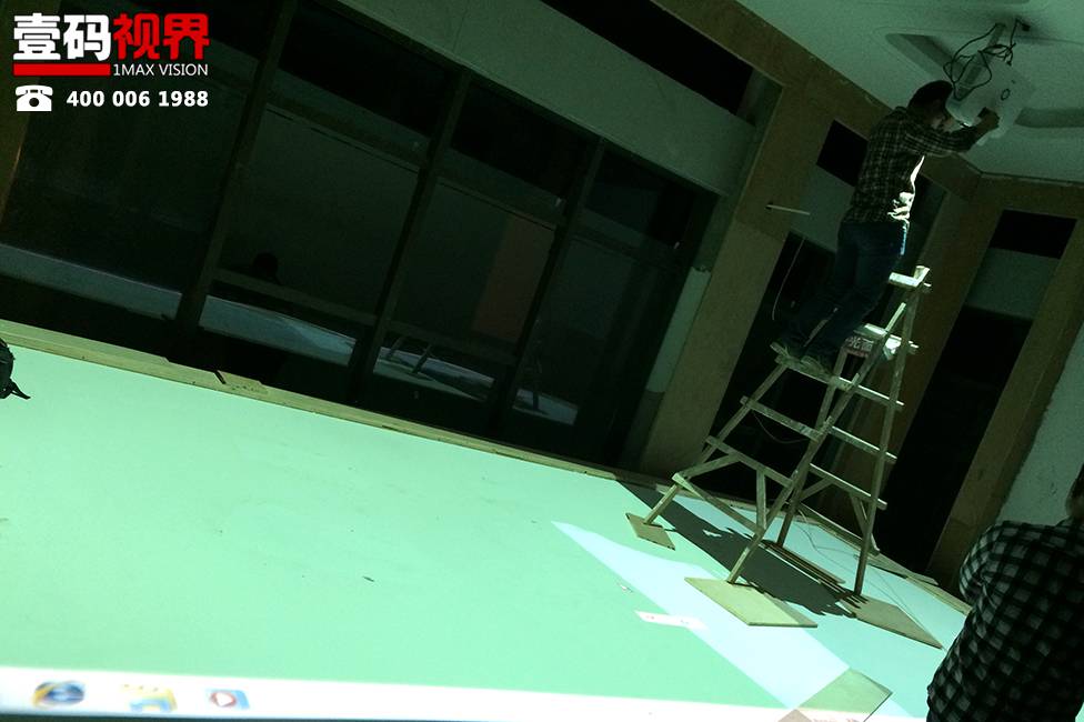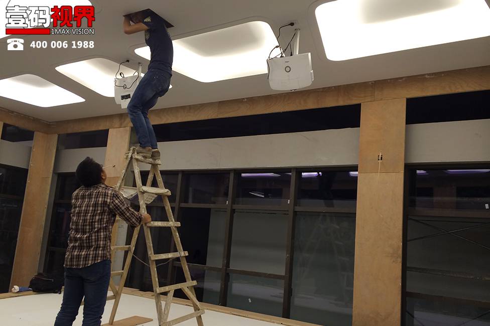實拍:壹碼視界數(shù)字沙盤施工人員安裝數(shù)字投影沙盤頂部工程投影機(jī)吊架。